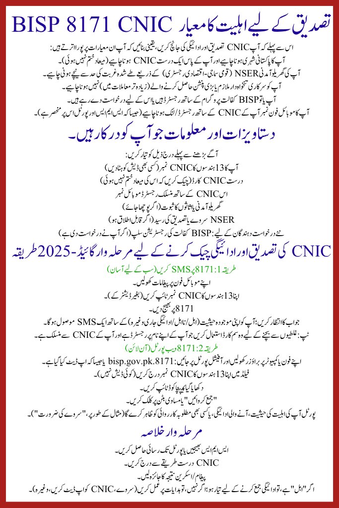 The 8171 CNIC confirmation is an official service provided by BISP that allows you to:
