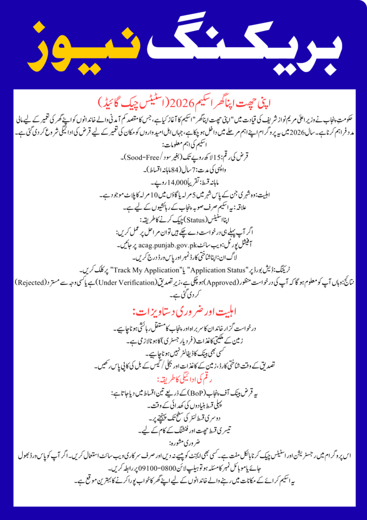 The Apni Chat Apna Ghar Scheme is a major housing initiative launched by the Government of Punjab under the leadership of Chief Minister Maryam Nawaz Sharif. This scheme is specially designed for low-income families who already own a small plot of land but do not have enough money to build a house. In 2026, the program has entered an important phase where approved applicants are receiving loan disbursements. Thousands of people are now searching online for Apni Chat Apna Ghar status check to see whether their application has been approved or not.