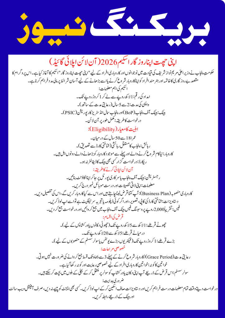 The Apni Chat Apna Rozgar Scheme 2026 is a major self-employment initiative launched by the Government of Punjab under the leadership of Chief Minister Maryam Nawaz Sharif. The purpose of this scheme is simple: help the youth, skilled workers, and small business owners start or expand their businesses through easy loans. In today’s economic situation, jobs are limited and inflation is high. This scheme aims to turn job seekers into job creators by providing financial support without heavy interest burden.