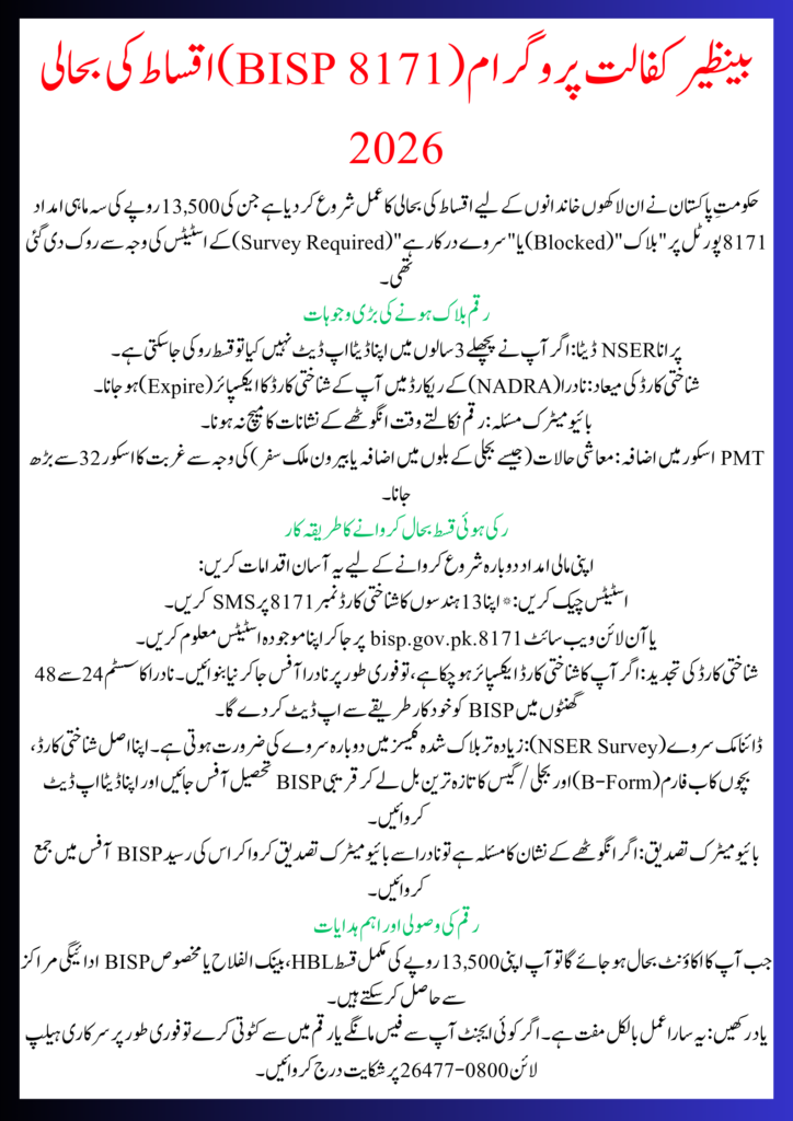 The BISP 8171 Installment Reactivation 2026 is an important update for millions of Pakistani families who depend on quarterly financial support under the Benazir Kafalat Program. In early 2026, many beneficiaries reported that their payments were showing “Blocked” or “Survey Required” on the 8171 portal. This usually happens due to expired NSER data, biometric mismatch, or CNIC issues. The good news is that the Government of Pakistan has simplified the reactivation process. By completing CNIC verification and updating your Dynamic NSER Survey, you can restore your installment of Rs. 13,500 and continue receiving support without delay.