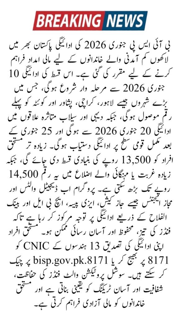The BISP January 2026 payment is a crucial support program for low-income families in Pakistan. With a phased schedule, digital wallet payments, and easy withdrawal through banks and authorized agents, beneficiaries can receive funds safely and conveniently. Checking payment dates via SMS or the official portal and following safety instructions ensures timely access to the BISP program’s financial support, helping families manage their household expenses efficiently.