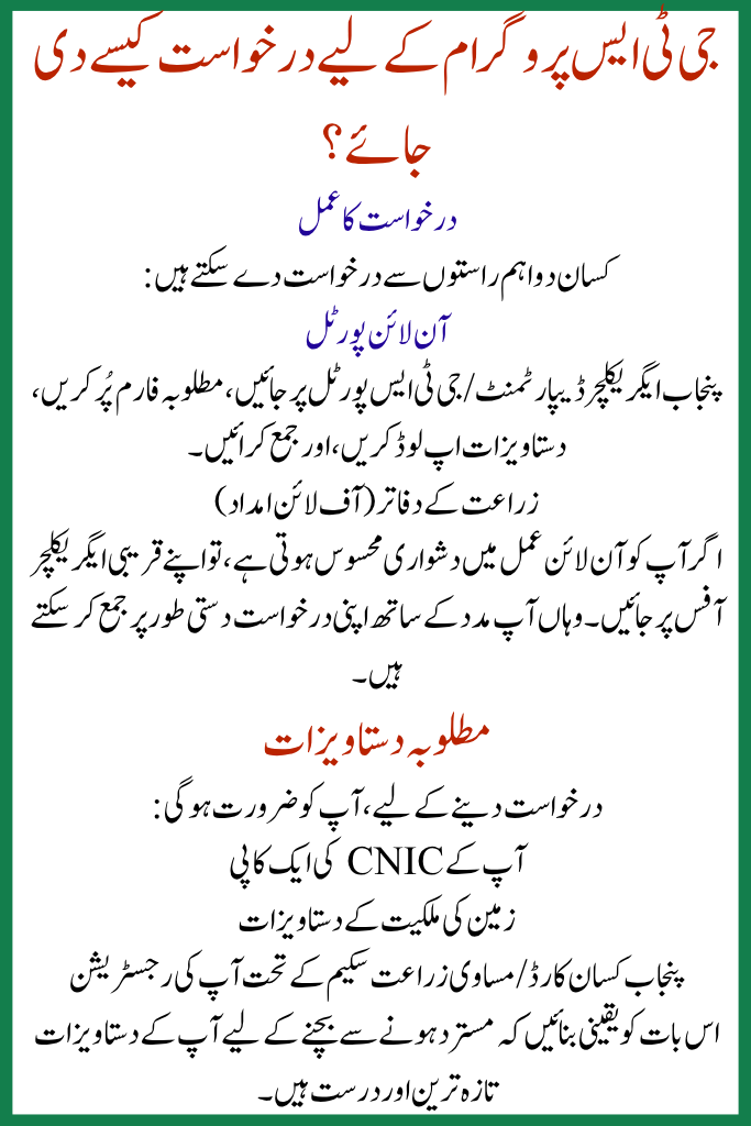- Online Portal Visit the Punjab Agriculture Department / GTS portal, fill the required form, upload documents, and submit.