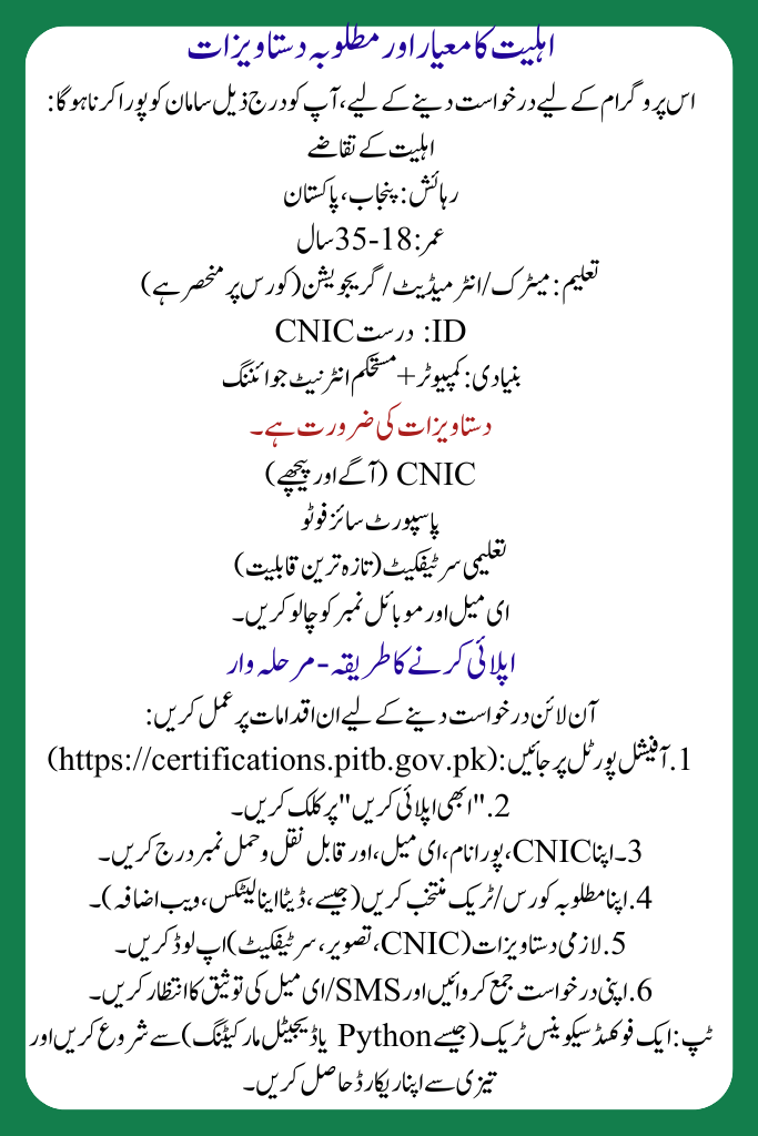 If you live in Punjab and are between 18–35 years, don’t miss this opportunity. Apply online at [certifications.pitb.gov.pk](https://certifications.pitb.gov.pk), pick your track, and start your journey toward a successful IT career in 2025.