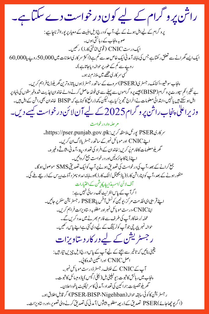| CM Punjab Rashan Program 2025 | April 29, 2025 | Ongoing (phase-wise) | Rs 3,000 per family | Online via PSER portal & local centres |