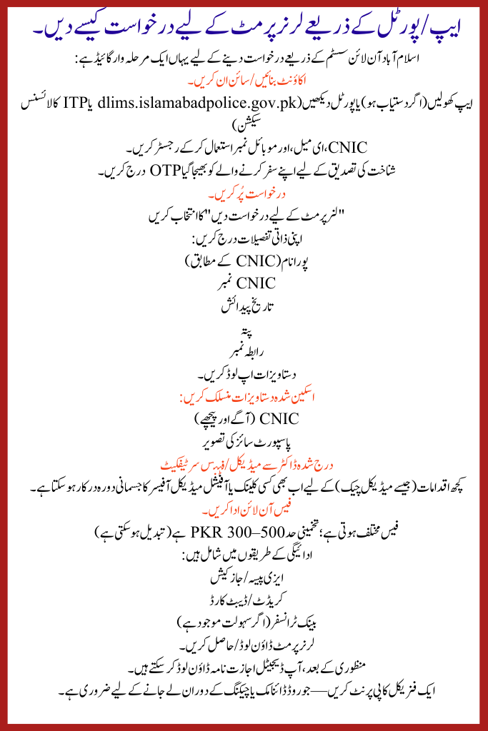 Here is a step-by-step guide to applying via the Islamabad Police New Online Learners Permit App online system: