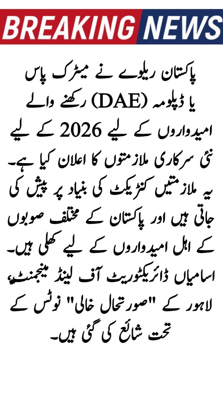 Pakistan Railways has announced new government jobs for 2026 for candidates who have passed Matric or hold a Diploma (DAE). These jobs are offered on a contract basis and are open to eligible candidates from different provinces of Pakistan. The vacancies are published under a “Situation Vacant” notice by the Directorate of Land Management, Lahore.