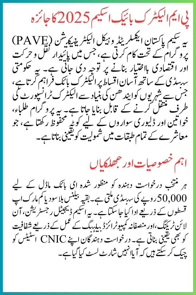 The scheme operates under the Pakistan Accelerated Vehicle Electrification (PAVE) Program, focusing on sustainable mobility and economic empowerment. It provides electric bikes on easy installments with a government subsidy, enabling citizens to shift from fuel-based to electric transport. The program reserves quotas for students, women, and delivery riders, ensuring inclusivity across all segments of society. Also Read: BISP Ehsaas Payment 2025 Guide (https://maryamkobatain1000.com.pk/bisp-ehsaas-payment-2025-guide-how-to-receive-money/)