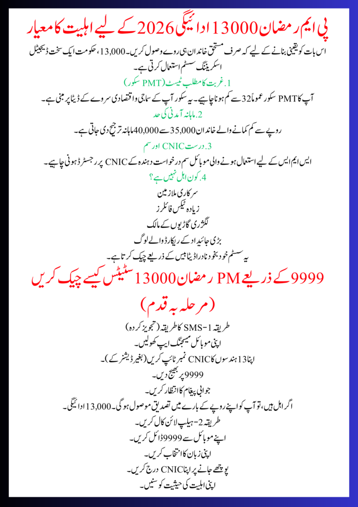The PM Ramzan 13000 Payment Scheme 2026 is one of the most important relief programs announced by the Government of Pakistan for low-income families before the holy month of Ramadan. Due to rising inflation and increasing food prices, the government has introduced a special Ramzan Relief Package to provide direct cash assistance of Rs. 13,000 to deserving households. In 2026, the system has been made fully digital through the 9999 SMS service and helpline, making it easier for people to check eligibility from home without visiting offices.