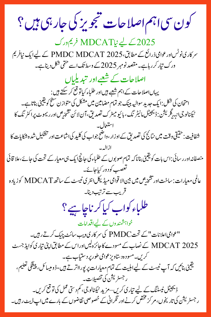 | MDCAT Reform Framework 2025 | Started 2025 (Committee formed Nov) | Framework expected by mid-November 2025 | Modernised syllabus, fairer question-bank, digital monitoring, transparency tools | Via official PMDC portal / University Testing Centres |