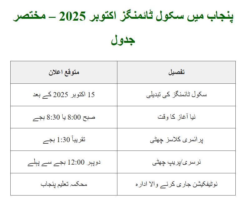 Punjab School Timings October 2025 – Quick Details Table
